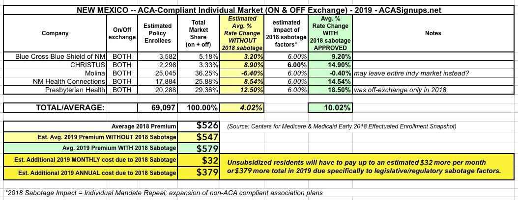 New Mexico was one of the earlier states to post their initial, requested 2019 ACA individual market premium hikes back in June. At the time, the five carriers asked for rate increases ranging from a slight drop (-0.4% for Molina) to as high as an 18.5% increase for Presbyterian Health, which is currently only offering off-exchange policies this year. Based on their preliminary filings, New Mexico was looking at a weighted average increase of around 10.0% next year, which would have been more like 4% if not for this years sabotage efforts by Trump and the GOP (mandate repeal & expansion of #ShortAssPlans):