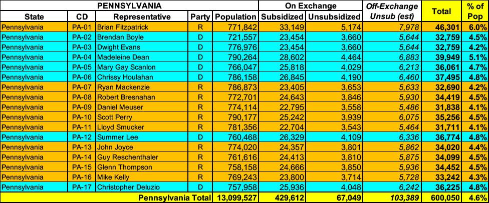 Pennsylvania has around ~496,000 residents enrolled in ACA exchange plans, 87% of whom are currently subsidized. I estimate they also have another ~103,000 unsubsidized off-exchange enrollees.